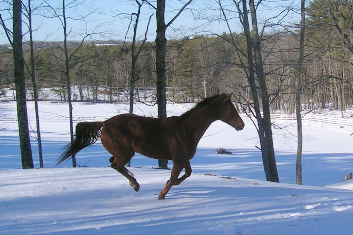 The wind finally let up by mid-Sunday, enough for me to want to ride. Saturday's brutal blasting winds kept me out of the saddle and the horses blanketed. This time, last year, the snow was gone (what little we had) and we were riding in flannel shirts, not jackets! We took Harley and Rolex for a trip up the power line where drifting snow still measured about a foot in places. Coming down off Big Bump, we had to cross a small brook. Rolex wasn't too keen to cross the water and peered at it as if to say, "What do I do now?" Harley , the birthday boy, took the lead and was happy to walk out front for a good portion of the ride.He got "stuck" a time or two, as did Rolex, where they switched leaders and supported each others fears. Your turn to go out front--oh no, I insist. They are quite a pair out there.